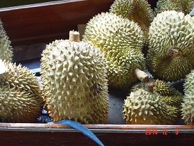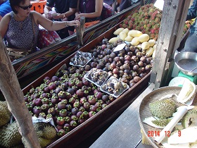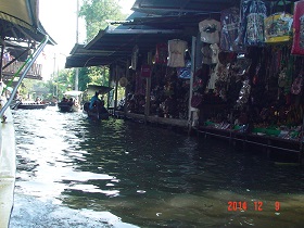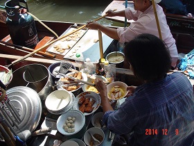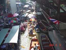 | ダムヌン水上マーケット(2014年12月) 水上マーケットも何ケ所かあります。 運河が張り巡らされ、その中でたくましく活動するタイの人達がおります。 果物、野菜、食べ物などを小舟に積み込み、込み合う水路の中で、売り込みます。 小舟が多く出、ぶつかり合いそうになりながらも、懸命に働いている様子に感動します。 |