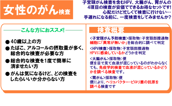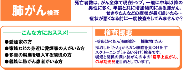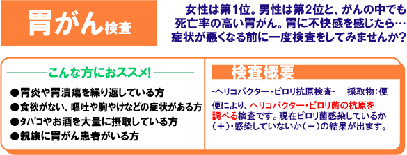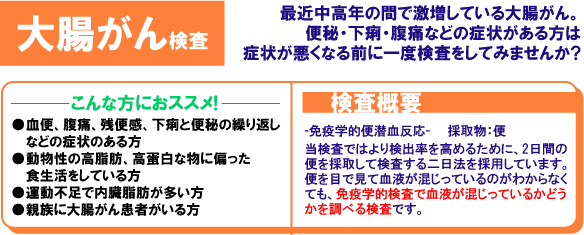 代表的ながんである、大腸がん、肺がん、胃がんの 3項目の検査が安価でできるお得なセット。