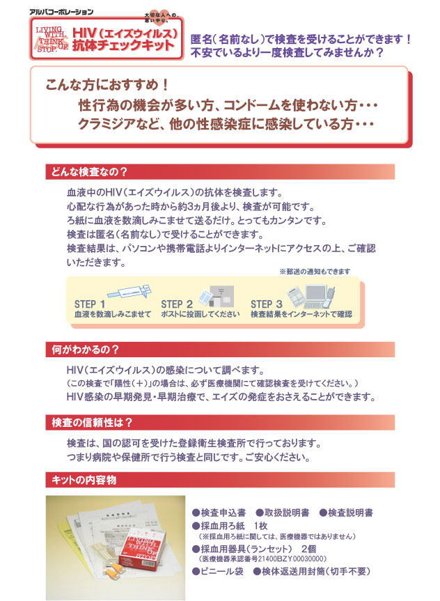 | この検査はエイズウィルス(HIV)感染のスクリーニング検査です。 HIVは早期に発見し、早期に治療を開始すれば、発病を食い止めることが可能になりつつあります。 当キットは日本で初めて自己採血によるHIV検査を可能にした検査キットです。 HIV抗体とは、HIVに感染した後につくられる抗体のことで、通常、感染後2〜3ヶ月以上経過すると、陽性が確認できるようになるといわれています。 UNAIDS(国連合同エイズ計画)の報告によると2002年1年間で新たにHIVに感染した人は500万人でHIV感染者は4200万人と推計されます。 日本では2003年3月30日の累計でAIDS患者が2,624人でHIV感染者が5,286人と報告されています。当検査にて陽性が確認された場合には専門の医療相談サービスが受けられます。 この検査でわかること:HIV抗体 |