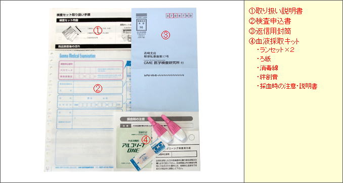 | セット内容 | 封筒・検査申込書・採血用ランセット・取扱説明書 |