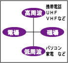 電磁波とは何かを振り返っておくと、ラジオ波、おなじみの遠赤外線や、日焼けや皮膚ガンの原因となる紫外線も、じつは電磁波の仲間です。そして、原子爆弾が発するガンマ線、レントゲンのX線もそうです。これら電磁波は、送電線をはじめ、ほとんどすべての電化製品から発せられています。生体に悪影響を与えるといわれるのは、送電線や一般の電化製品から放射されるELFと呼ばれる極低周波(0〜100ヘルツ)の交流電流から発生する磁場(磁界)と携帯電話、電子レンジ等から放射されるマイクロ波(UHF)と呼ばれる極超短波((300MHz〜3GHz)です。